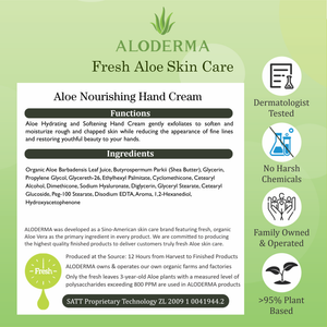 We are proud to carry products from ALODERMA, our sister company. ALODERMA's Aloe Nourishing Hand Cream is made with 66% fresh organic certified Aloe processed within 12 Hours of Harvest to guarantee the maximum bioactivity. Perfect for: